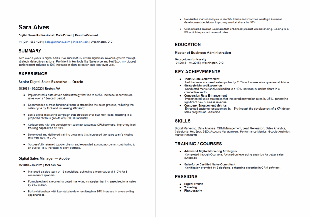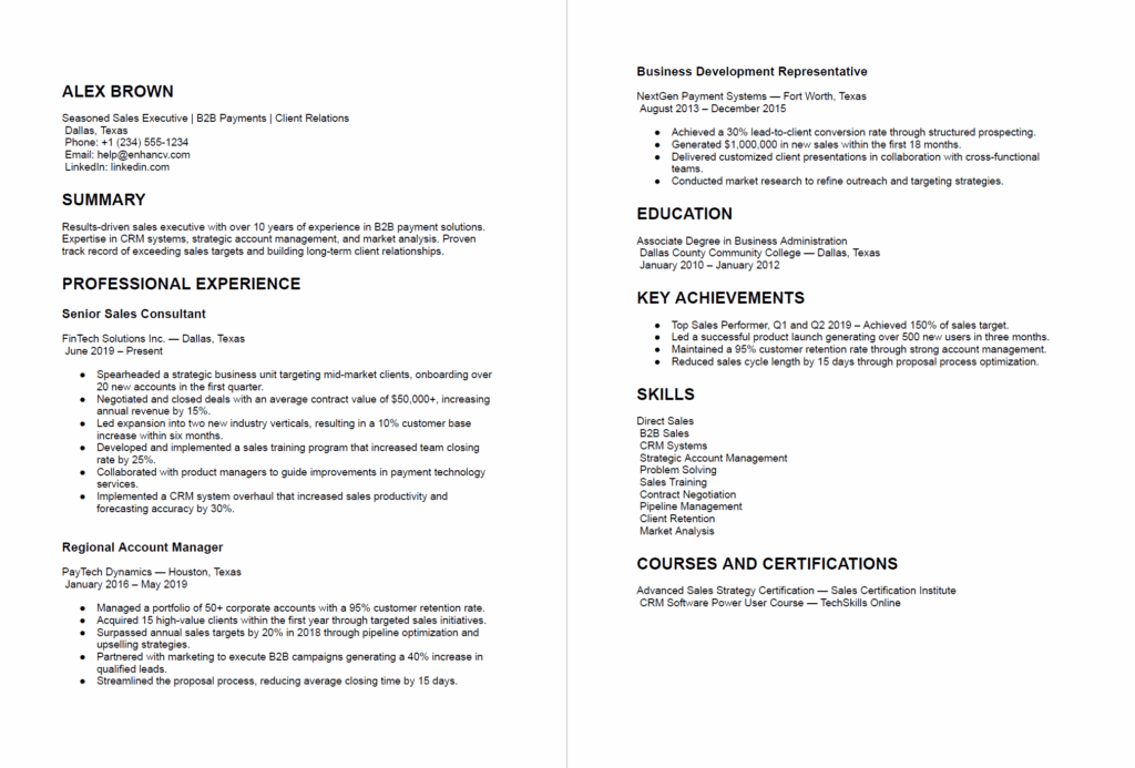 A senior sales professional’s resume targeting VP of Sales, Sales Director, or Enterprise Account Executive roles must tell a story of strategic leadership and significant financial impact. Typically, this resume is two pages and focuses on P&L responsibility, team management, and long-term strategic view.