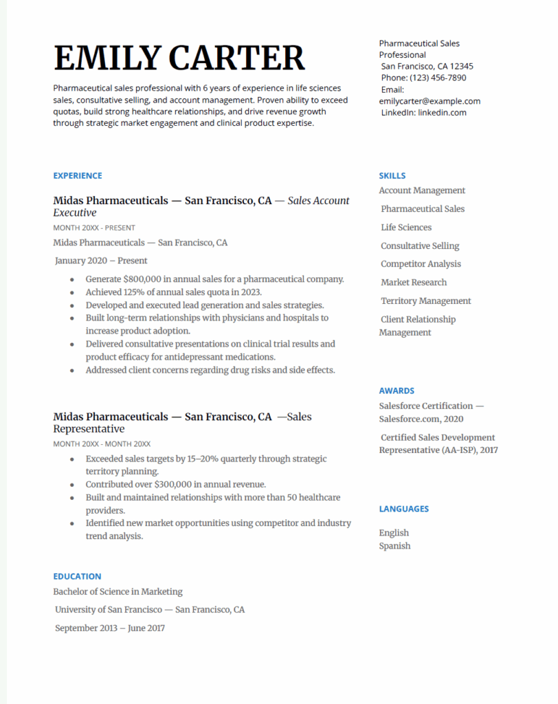 - Combination/Hybrid: This format begins with a strong professional summary (or “Skills Profile”) then has the traditional chronological work experience section. This is often the best choice for a more experienced sales professional because they can lead with the most impressive metrics and details about their careers.
